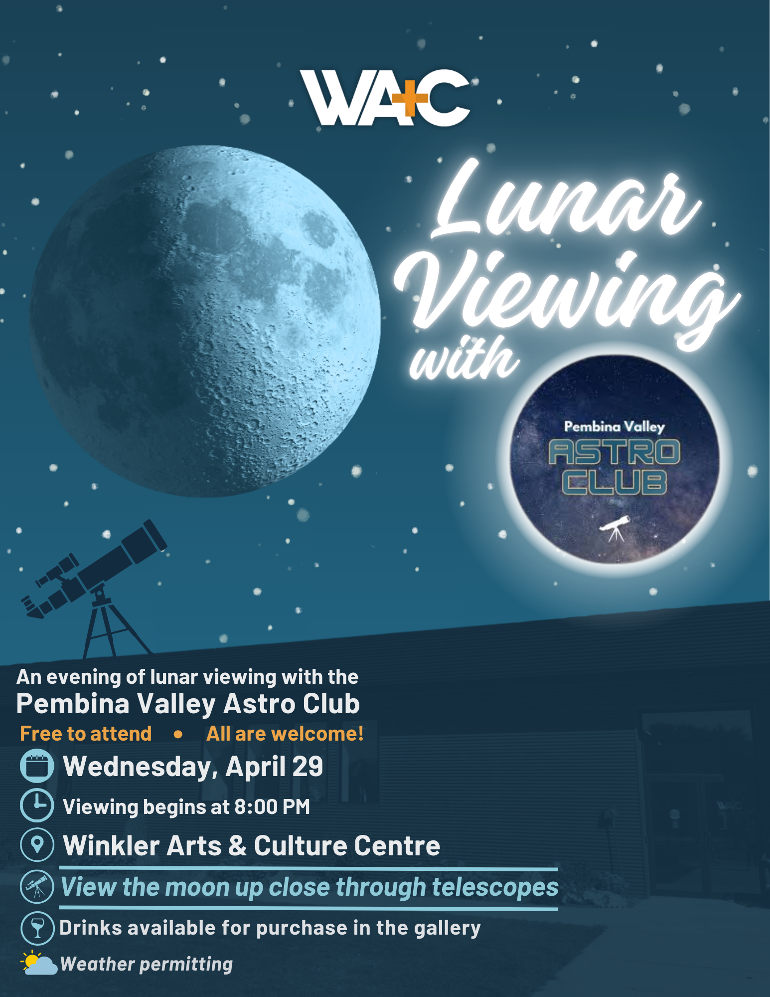 Spend an evening under the night sky as we turn our focus to the moon. In partnership with the Pembina Valley Astro Club, this lunar viewing event offers a chance to see incredible detail through telescopes and connect with others in a unique gallery experience.
