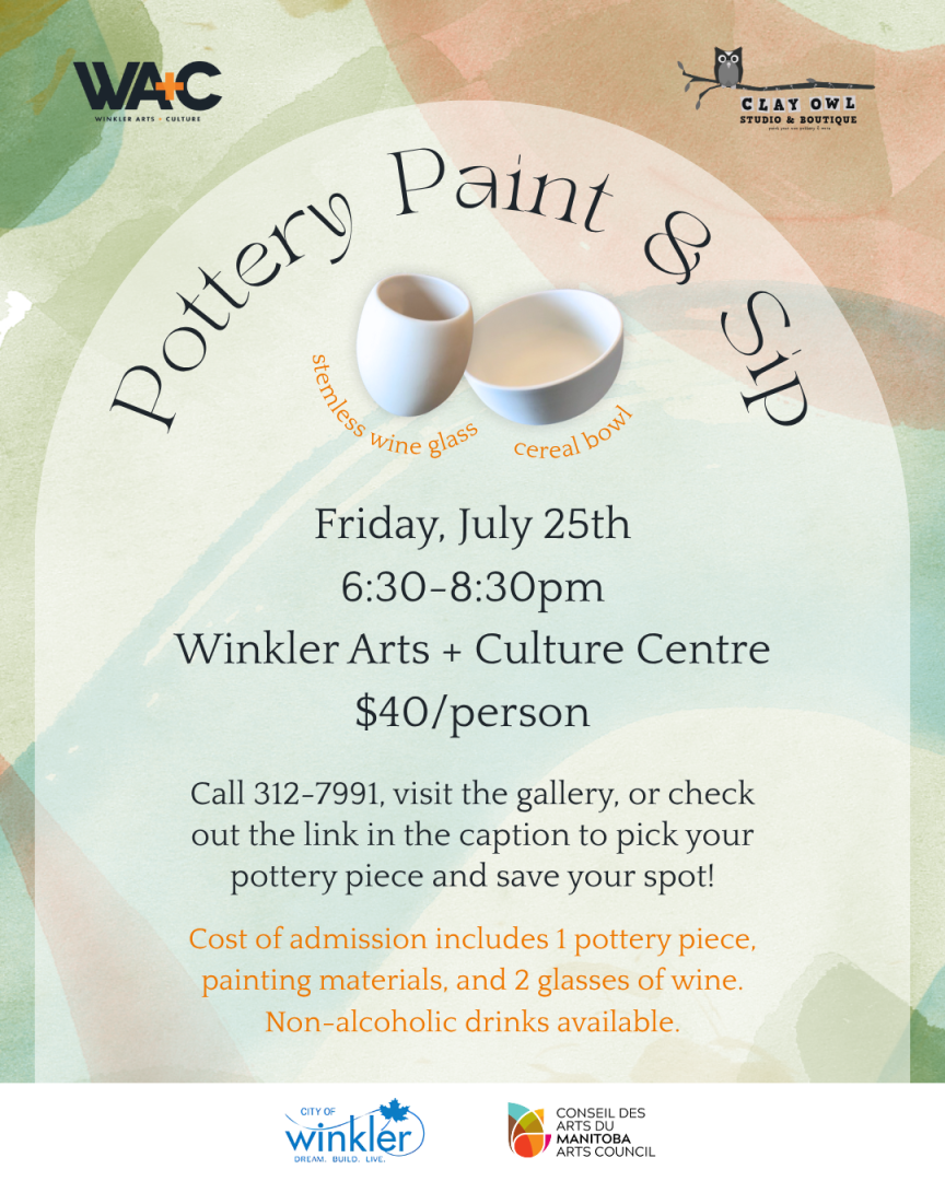 Join us and Clay Owl for a relaxed evening of pottery-painting and wine-sipping! Choose between a stemless wine glass or a cereal bowl and paint it however you’d like while you sip on some wine and have a quiet self-care evening, a fun friend outing, or a cozy quality-time date! *Must be 18 or older to attend.